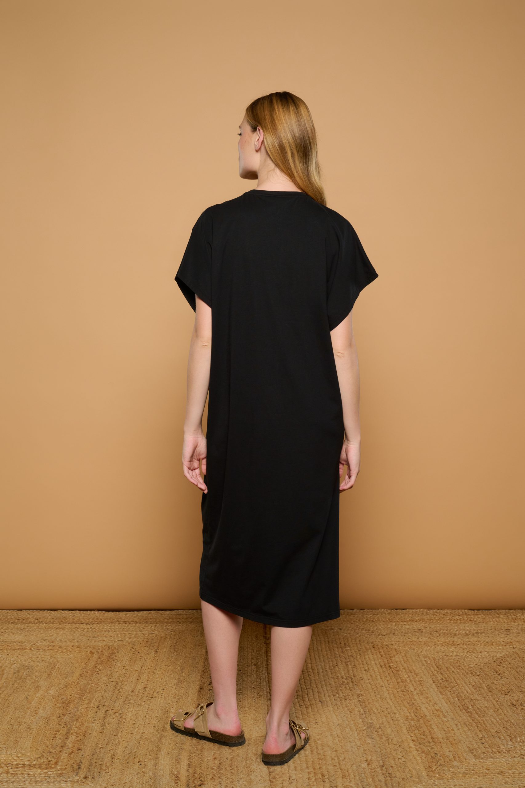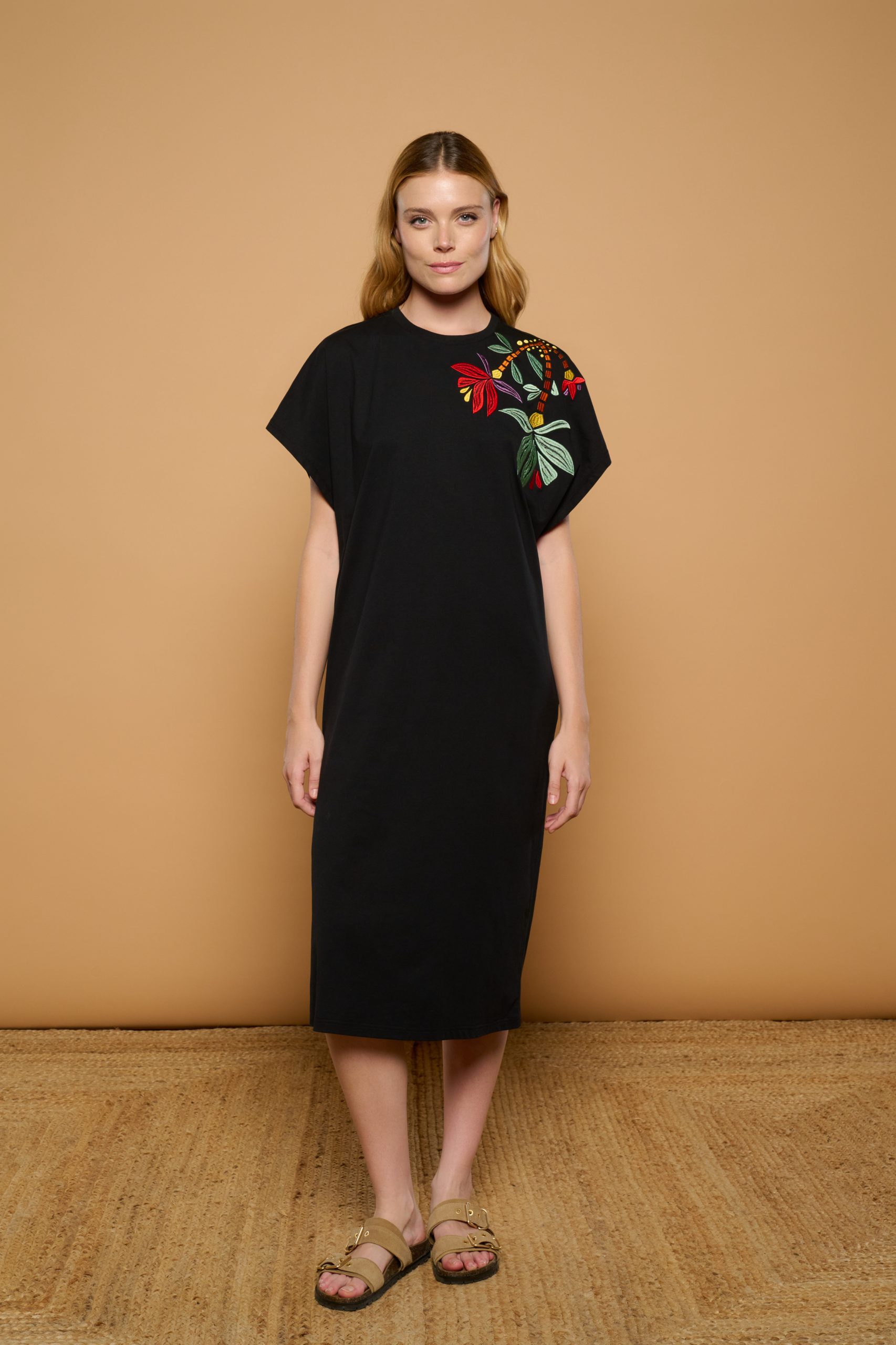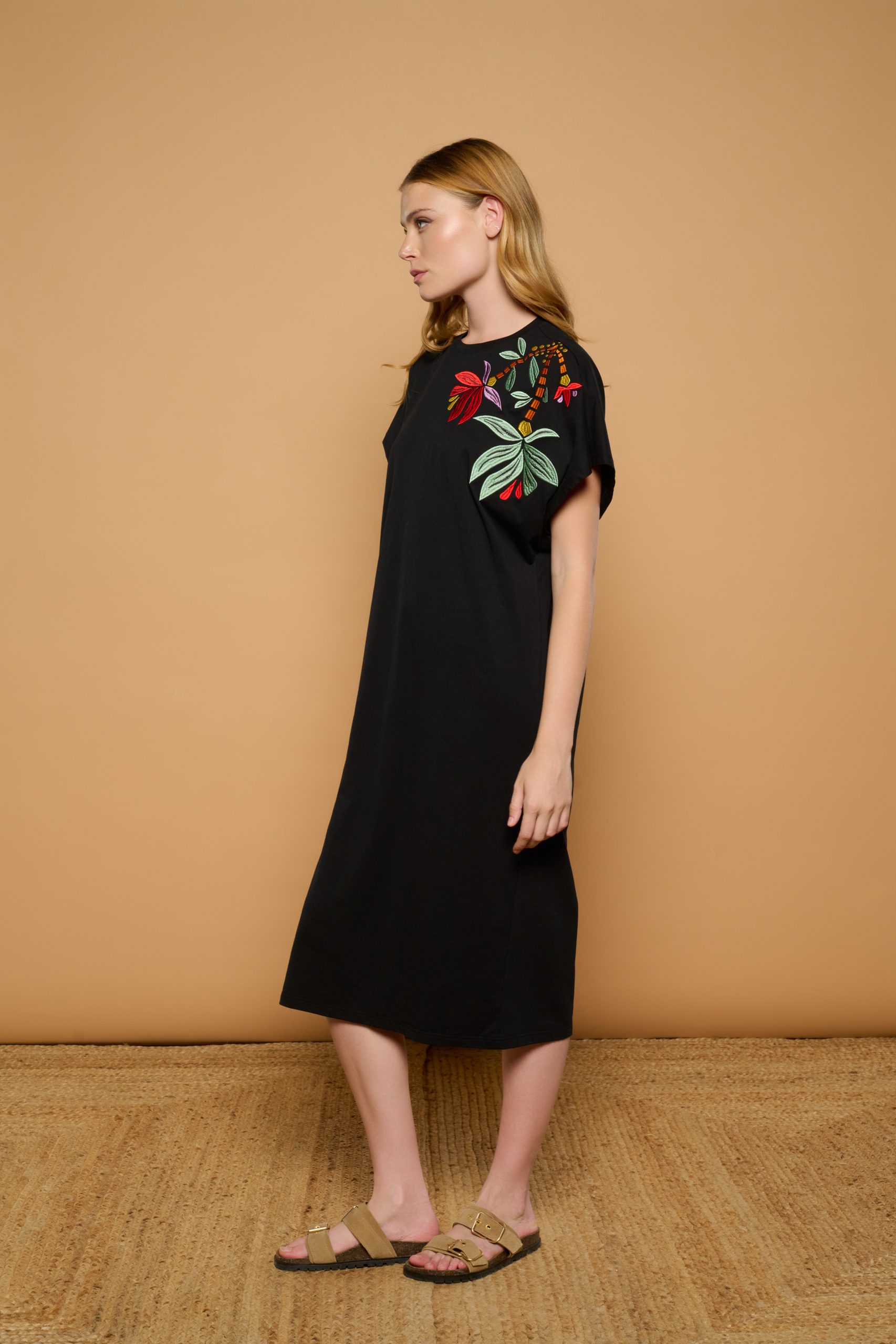 Sweatshirt midi dress with a round neck and long sleeves. Bohemian-style floral embroidery detail on the shoulder. Side slit. Stretch cotton fabric.