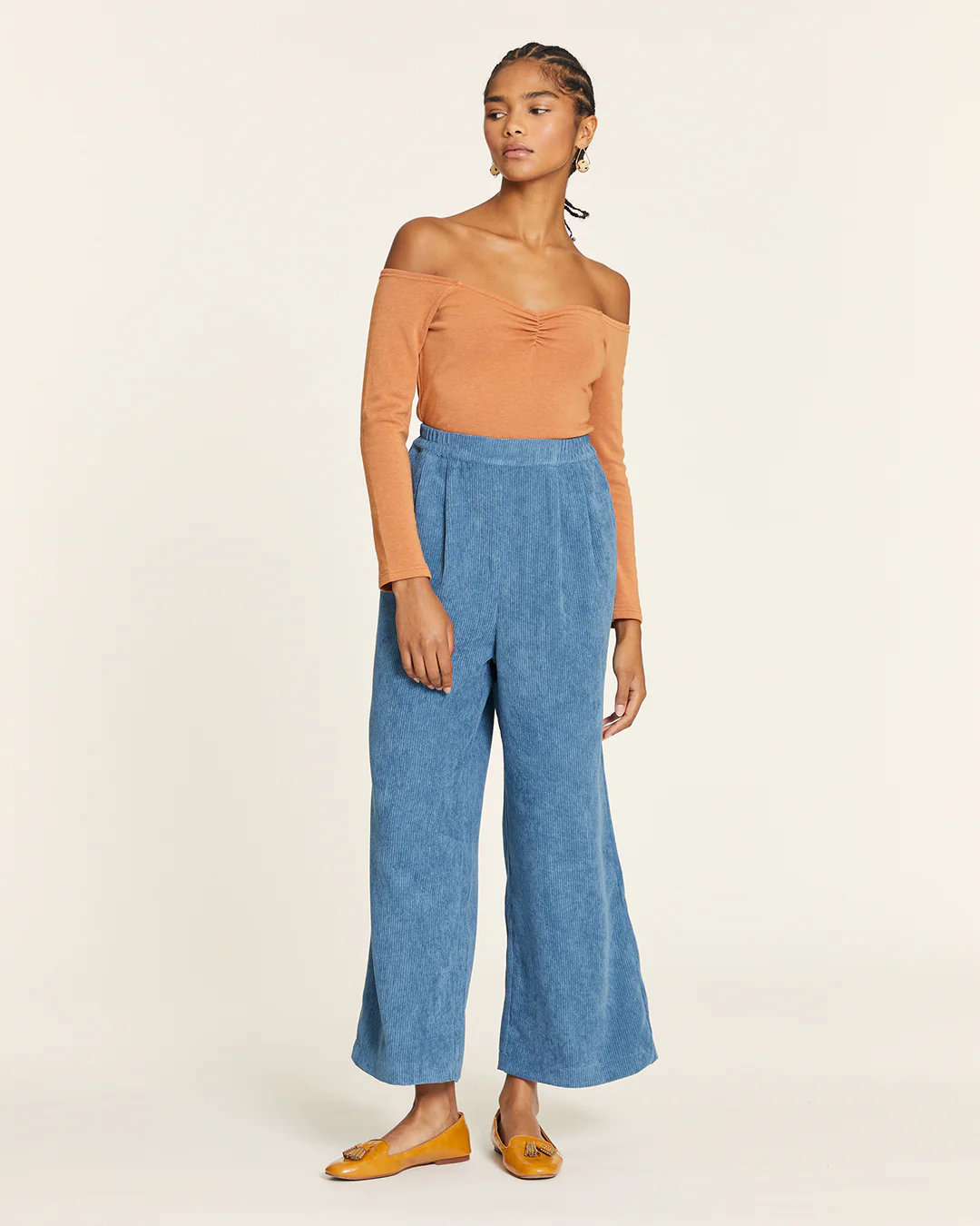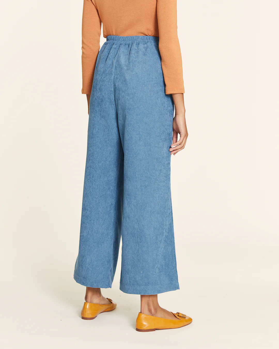 High-waisted culotte with a double front pleat, slanted pockets, and an elastic waistband for added comfort.