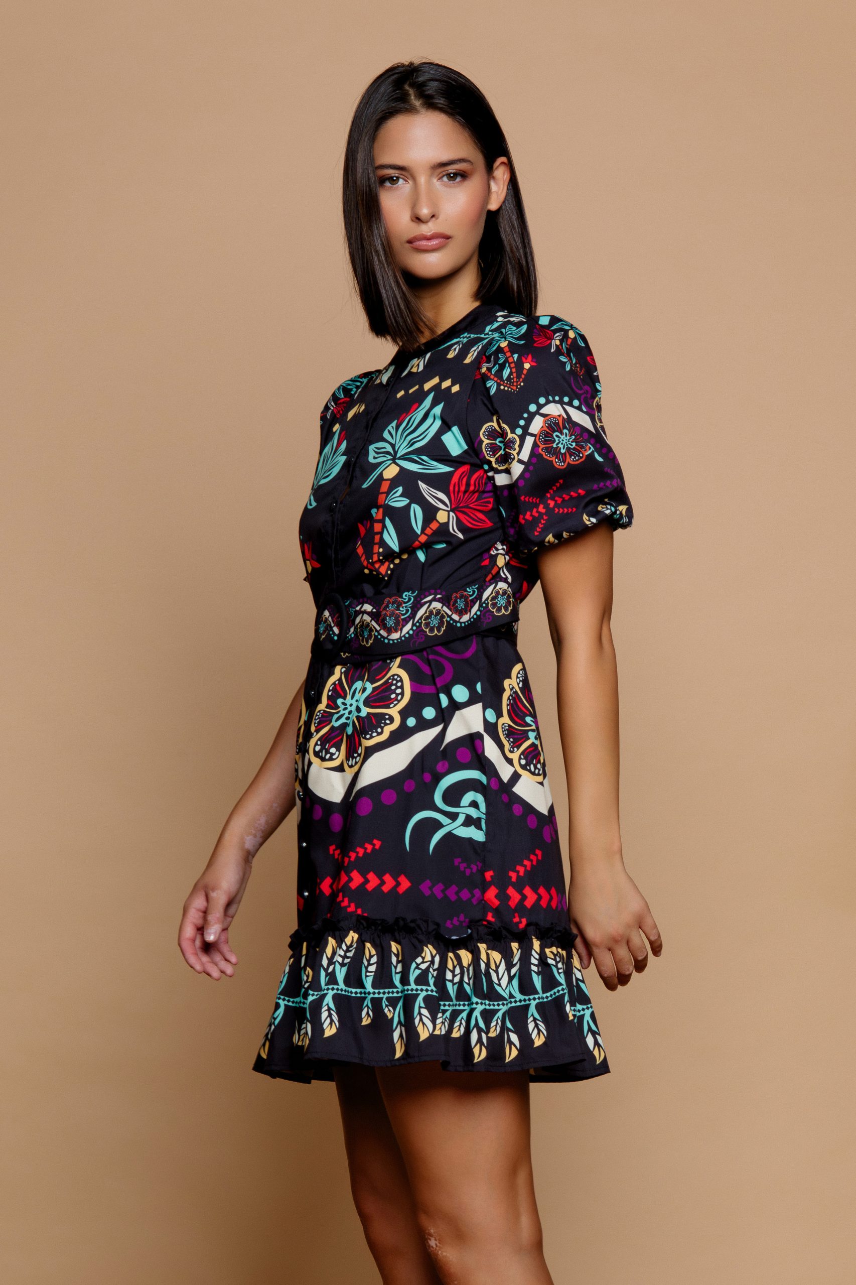 Shirt-style mini dress. Mandarin collar and short flared sleeves. Front button closure. Exotic print. 100% cotton lining. Includes matching printed belt with a fabric-covered circular buckle.