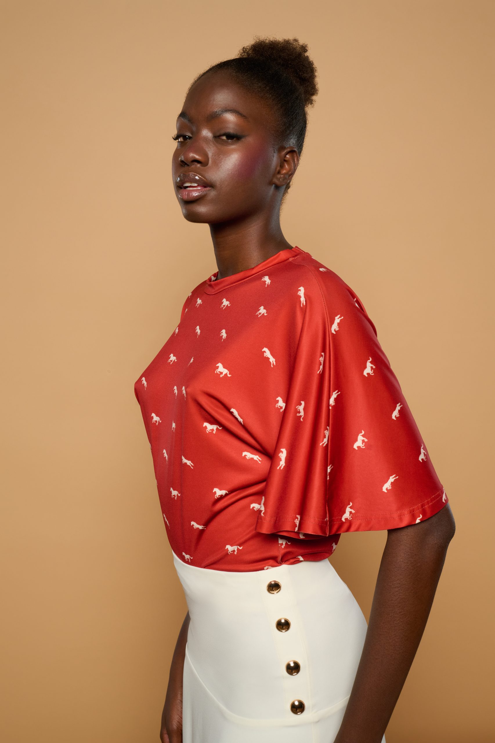 Round-neck short-sleeved T-shirt. Horse print on stretch fabric.