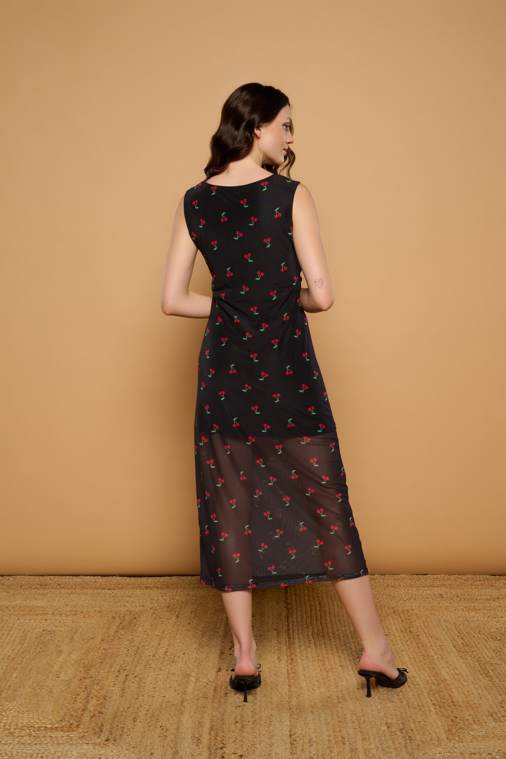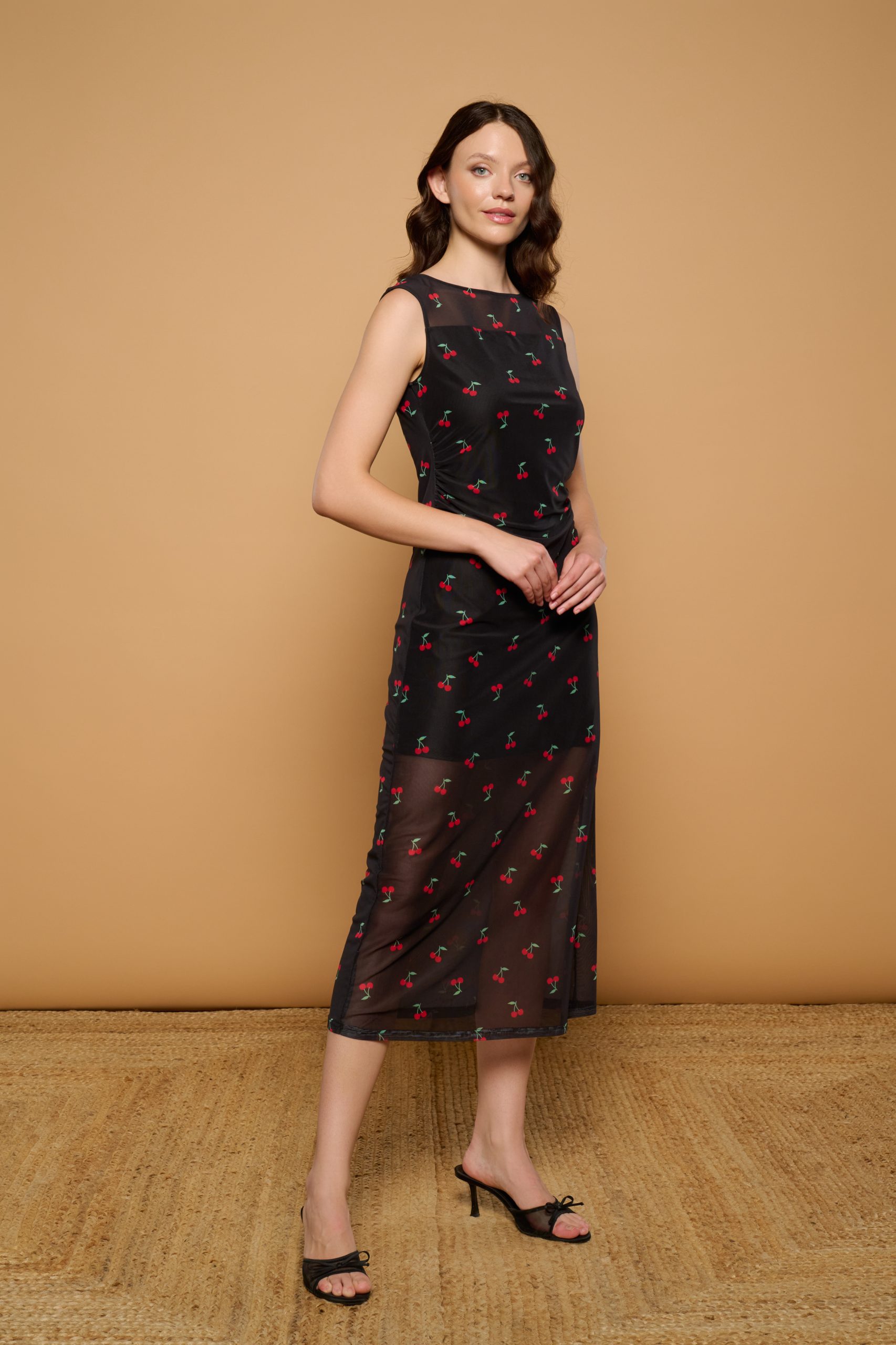 Round-neck sleeveless midi dress. Semi-sheer black stretch tulle fabric with a red cherry print. Matching short inner lining. Slight gathering detail.