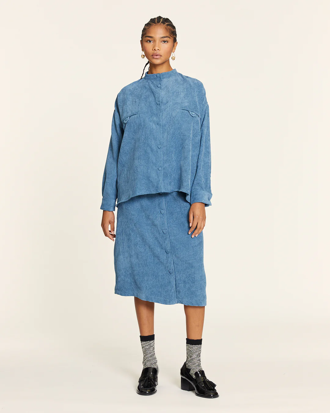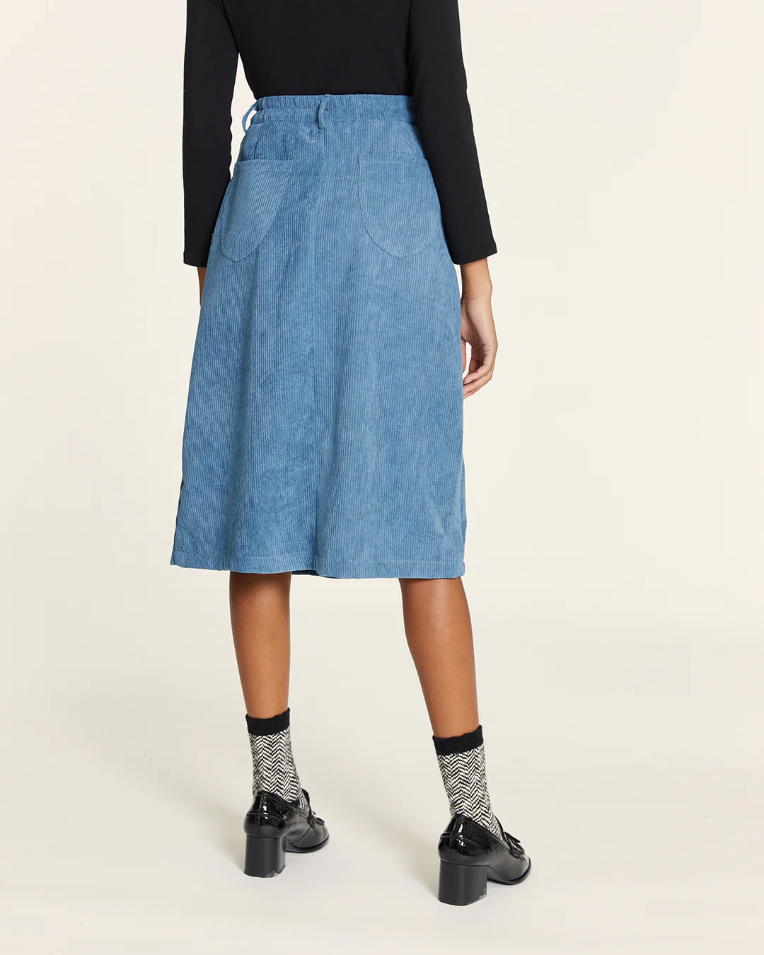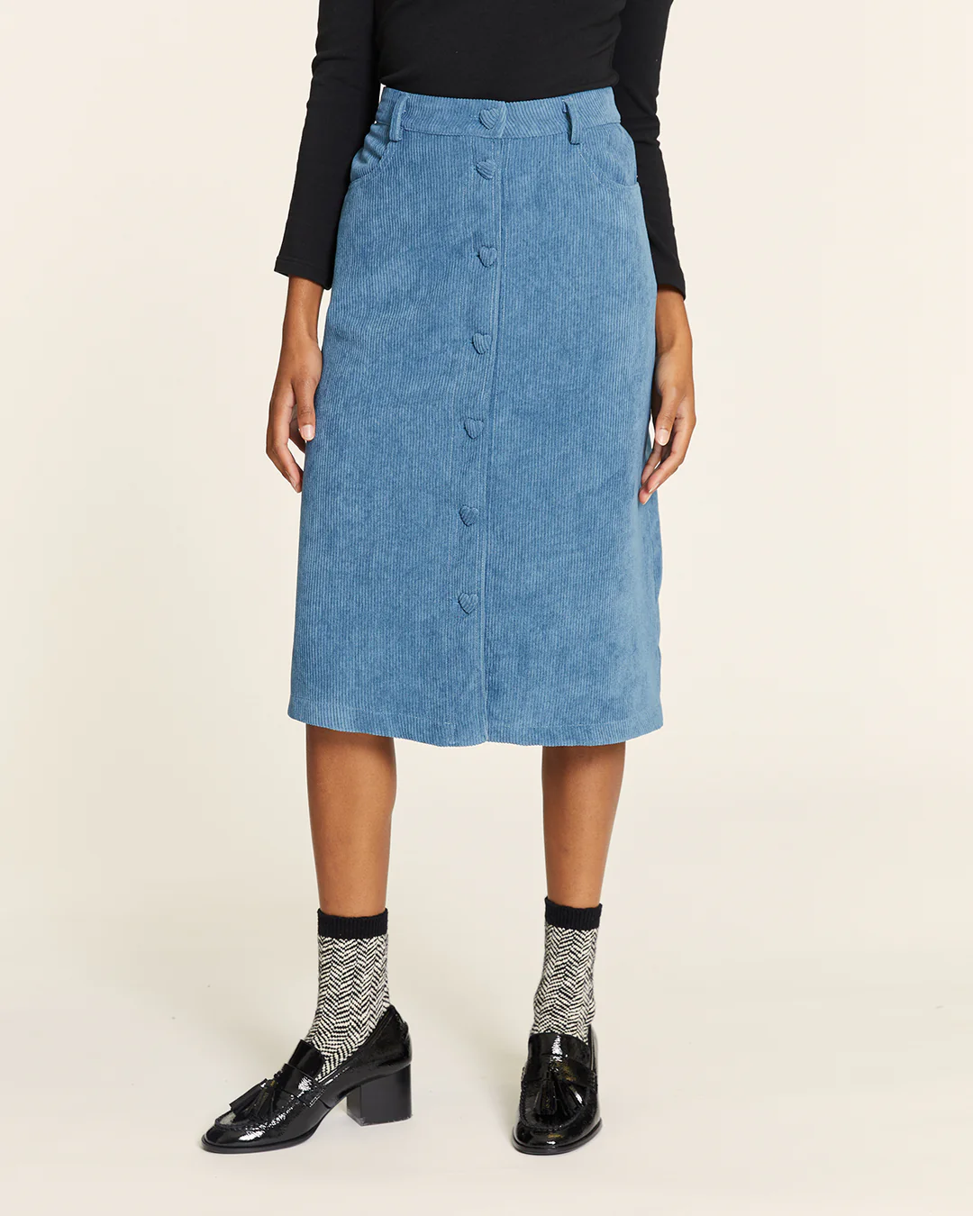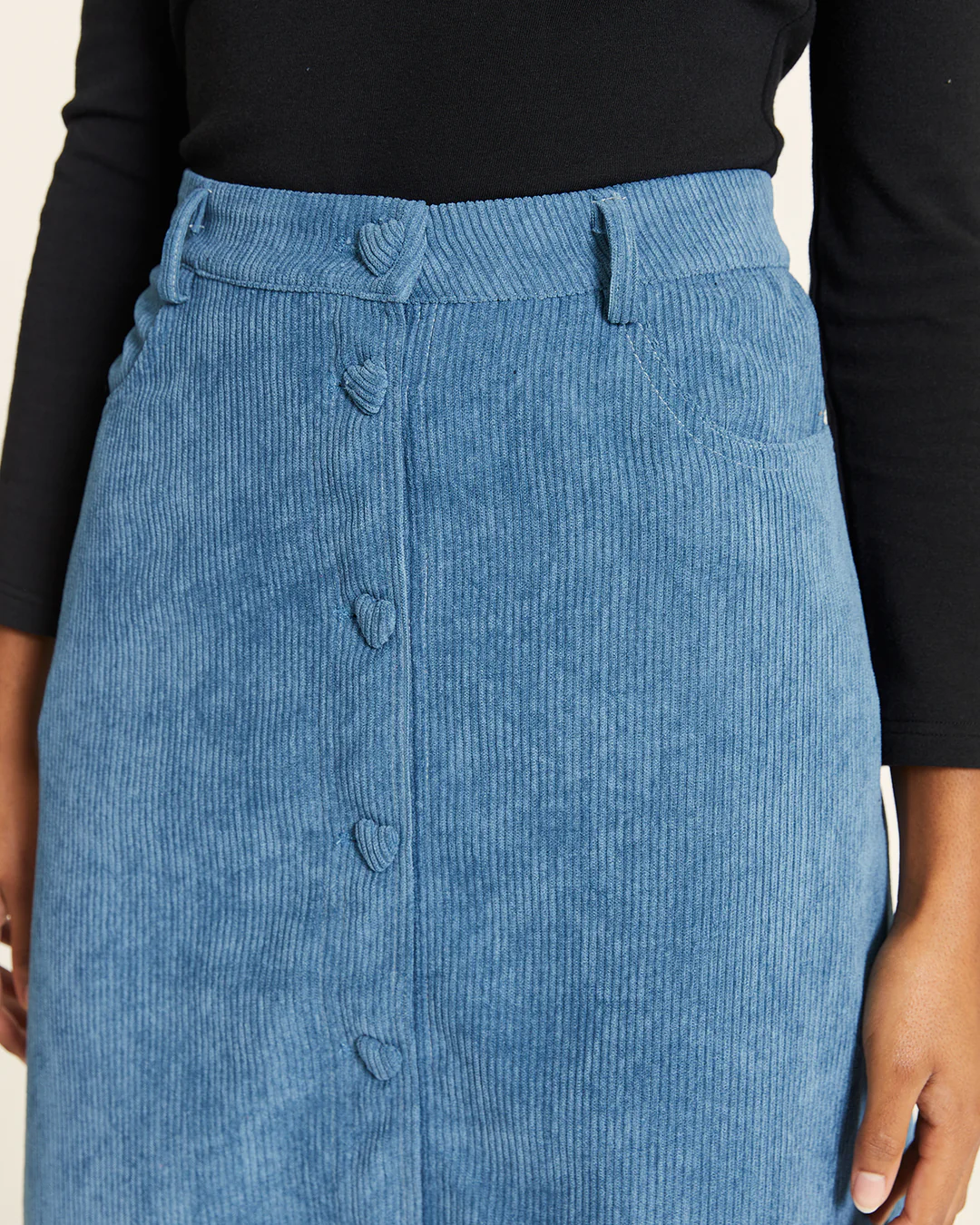 Corduroy midi skirt with heart-shaped buttons on the front. It features front pockets and patch pockets on the back.