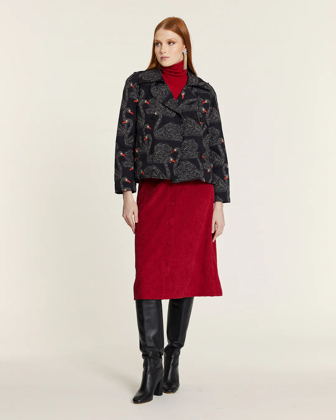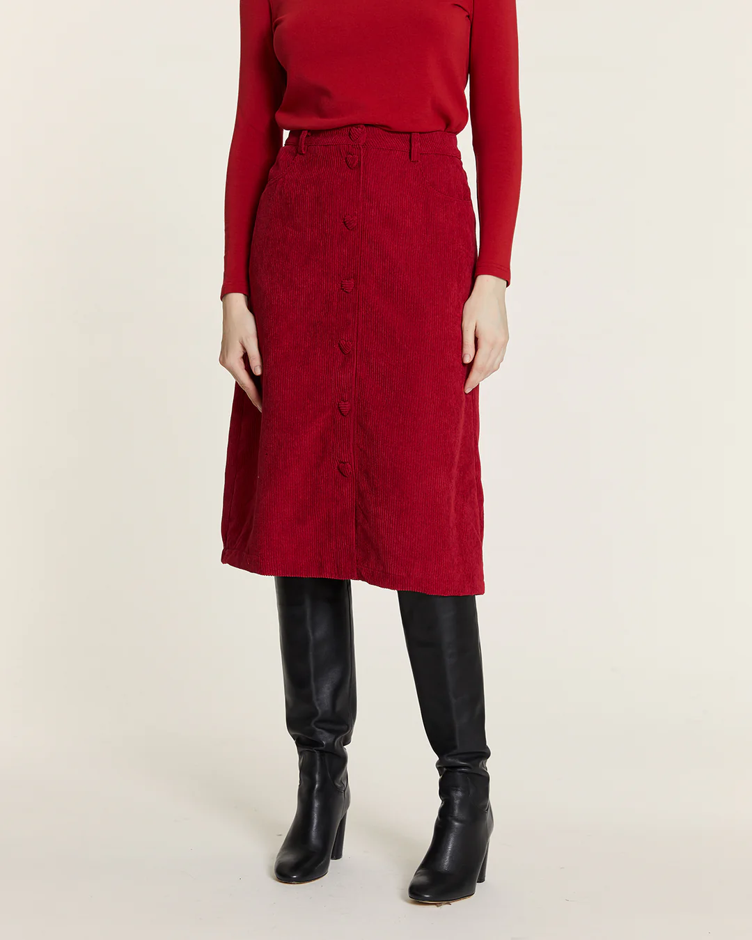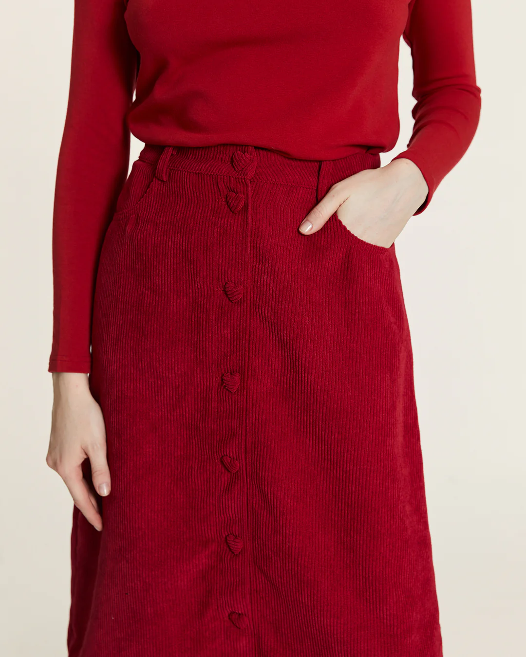 Corduroy midi skirt with heart-shaped buttons on the front. It features front pockets and patch pockets on the back.