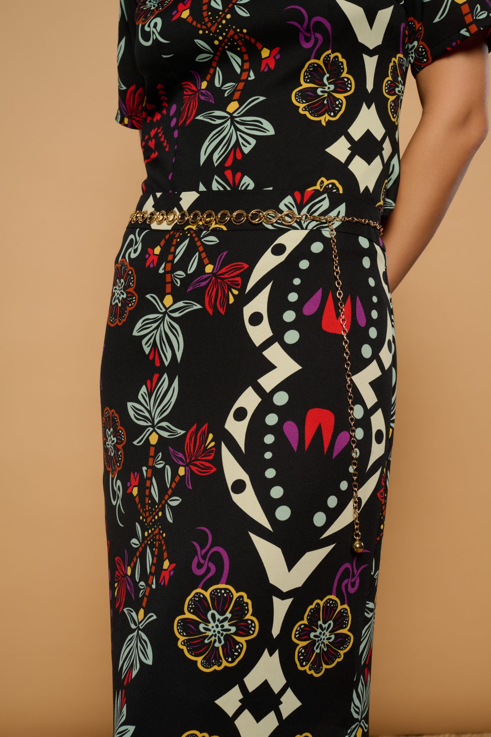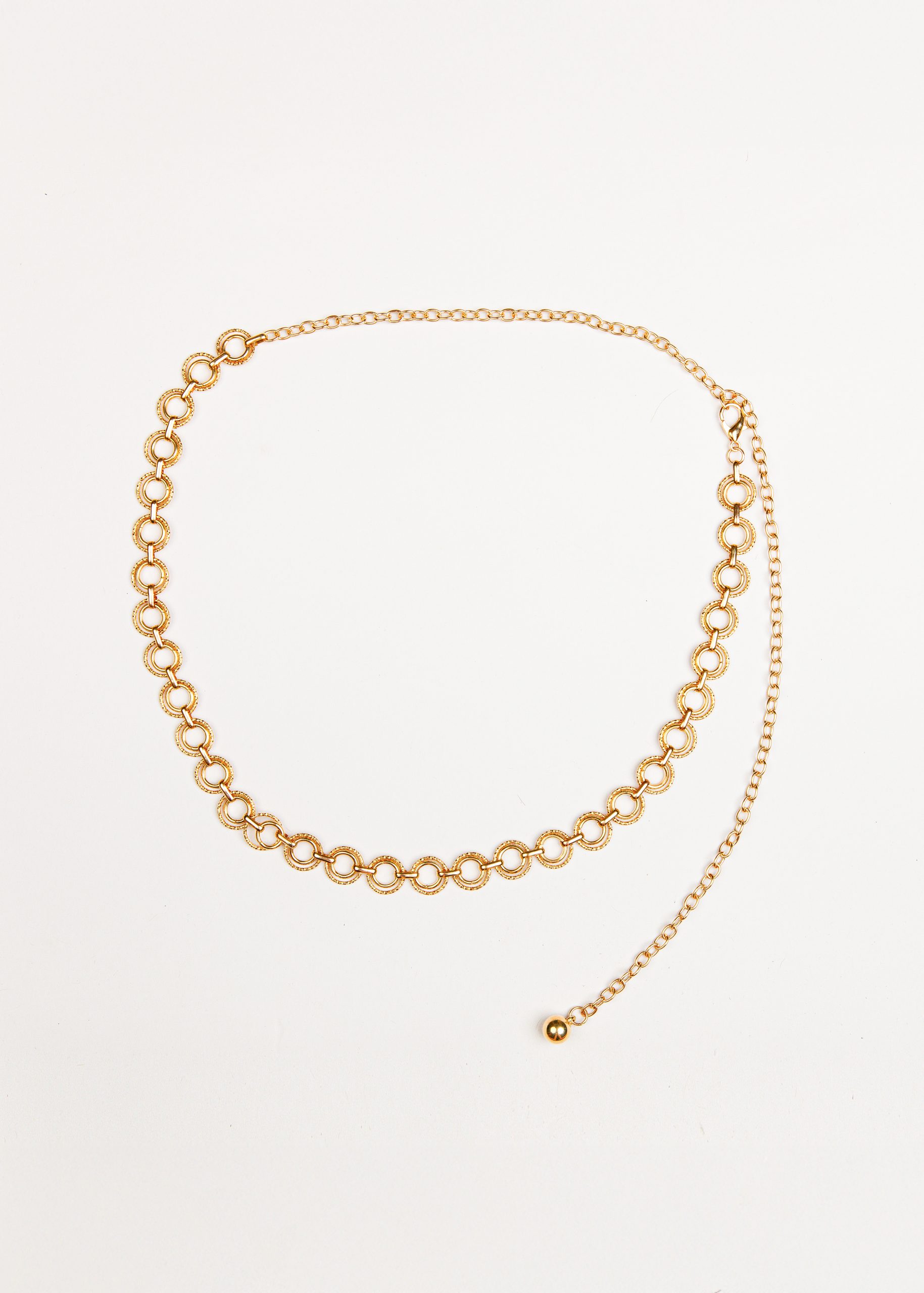Textured circular link chain belt. Adjustable lobster clasp closure with a metallic ball charm at the end. Gold.