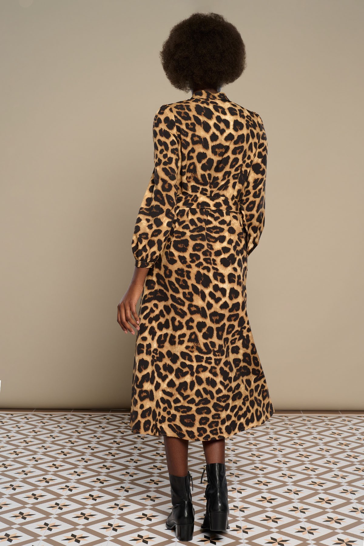 Midi shirt dress with mao collar. Long sleeves. Closure with front buttons. Animal print print. Belt included.