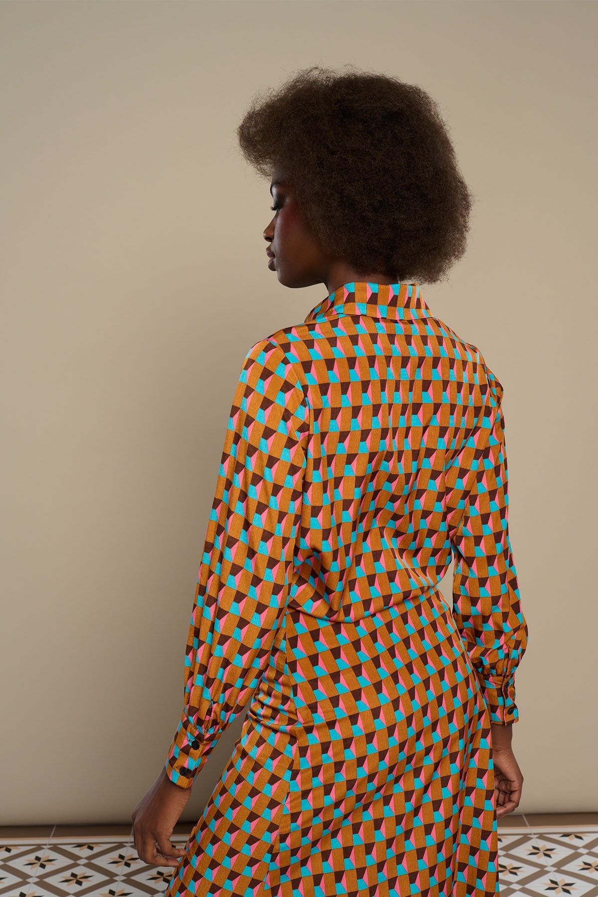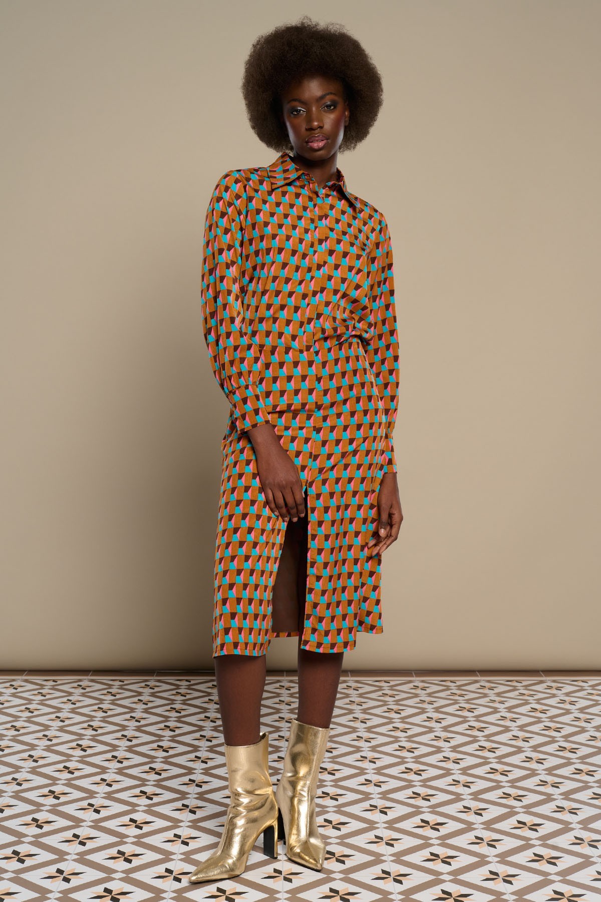 Shirt with lapel collar and long sleeves finished in cuff. Closure with front hidden buttons with lapel. Geometric print.