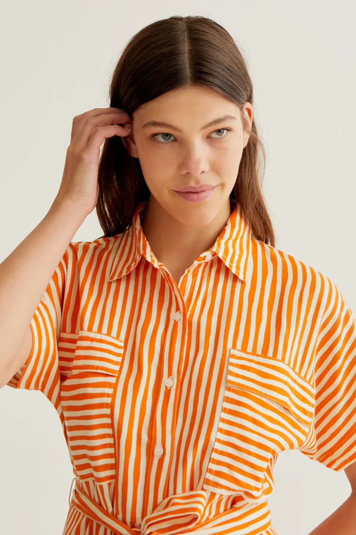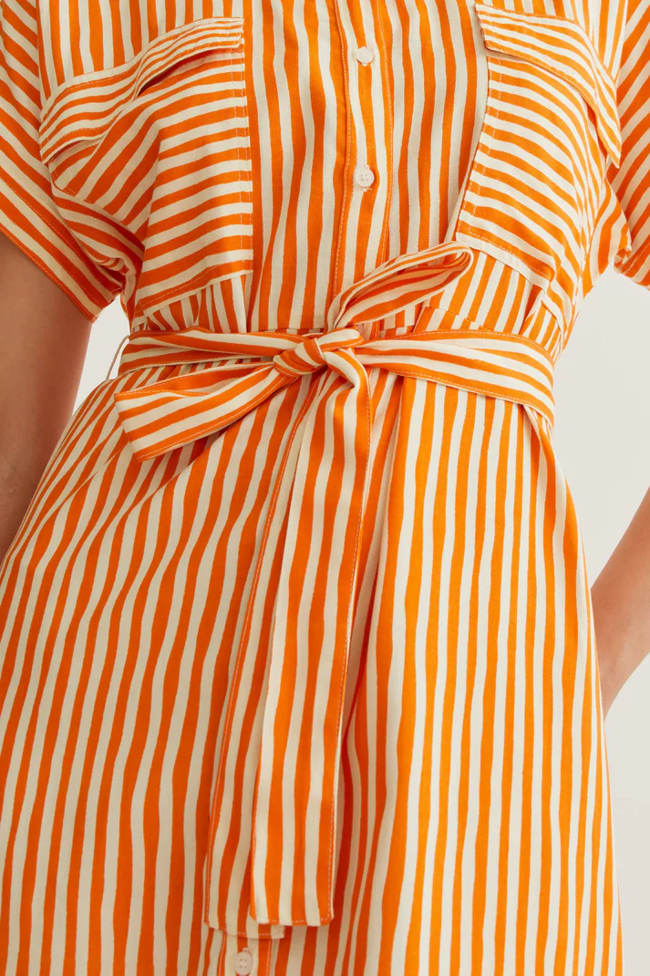 Midi dress with a lavagna orange print. Lapel collar and dropped shoulders. Front button closure with white buttons. Tie waist. Front flap pockets.