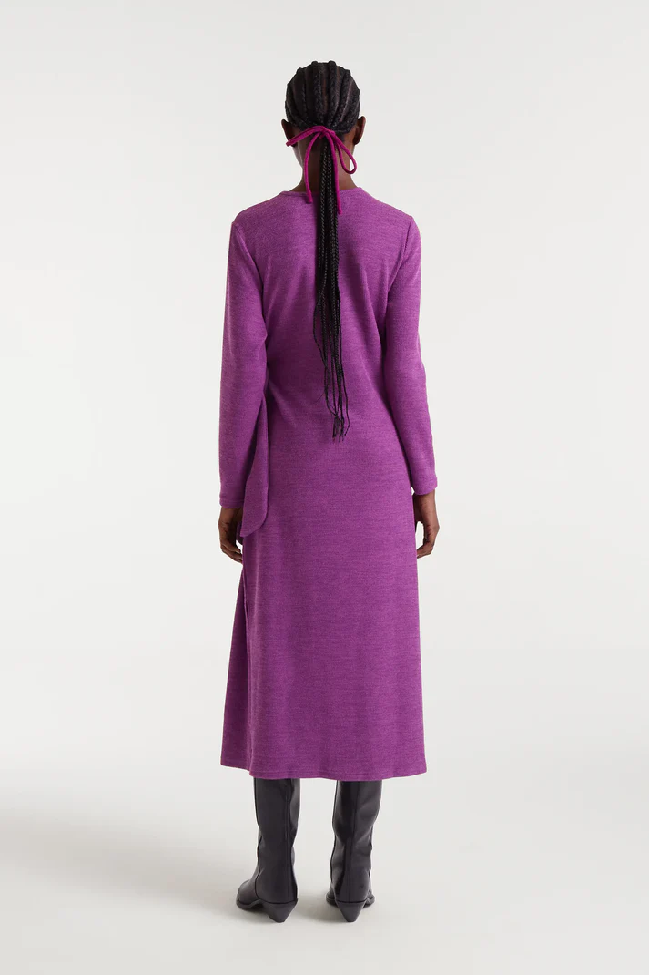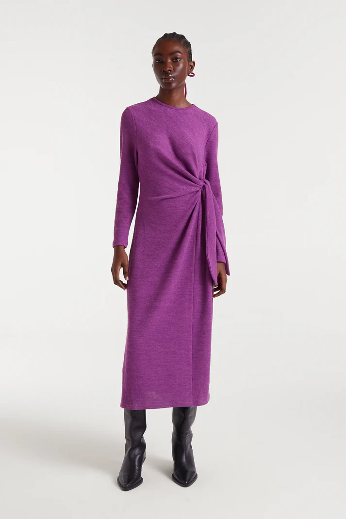 Μακρύ φόρεμα από πλεκτό με ριμπ ύφανση σε μωβ απόχρωση. Στρογγυλή λαιμόκοψη και μακριά μανίκια. Ελαφρώς πεσμένοι ώμοι. Λεπτομέρεια πλαϊνού δέσιμο.