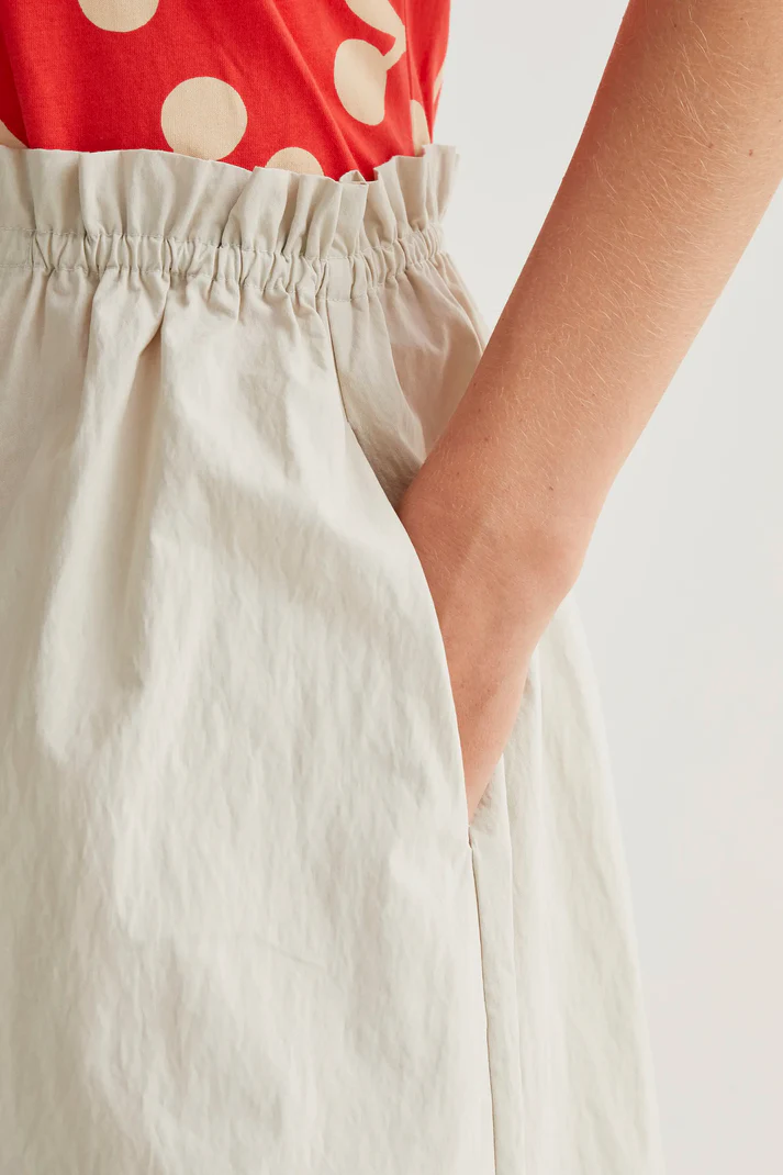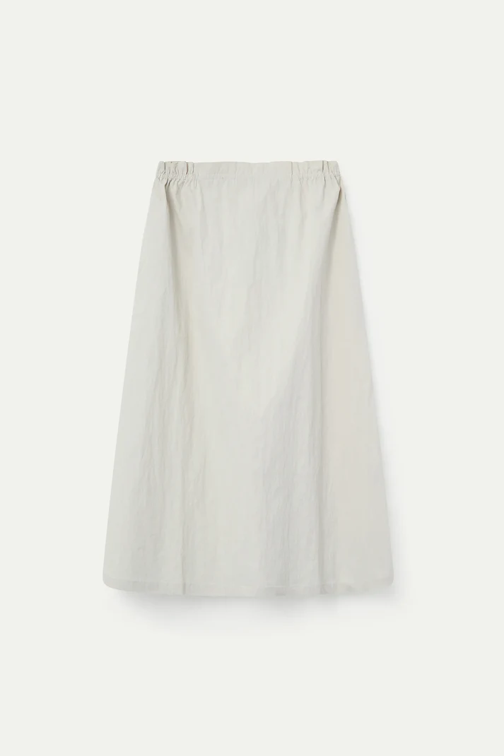 Off-white midi skirt made from 70% cotton and 30% polyamide. High-waisted elasticated fixed waistband. Side pockets. Relaxed fit.