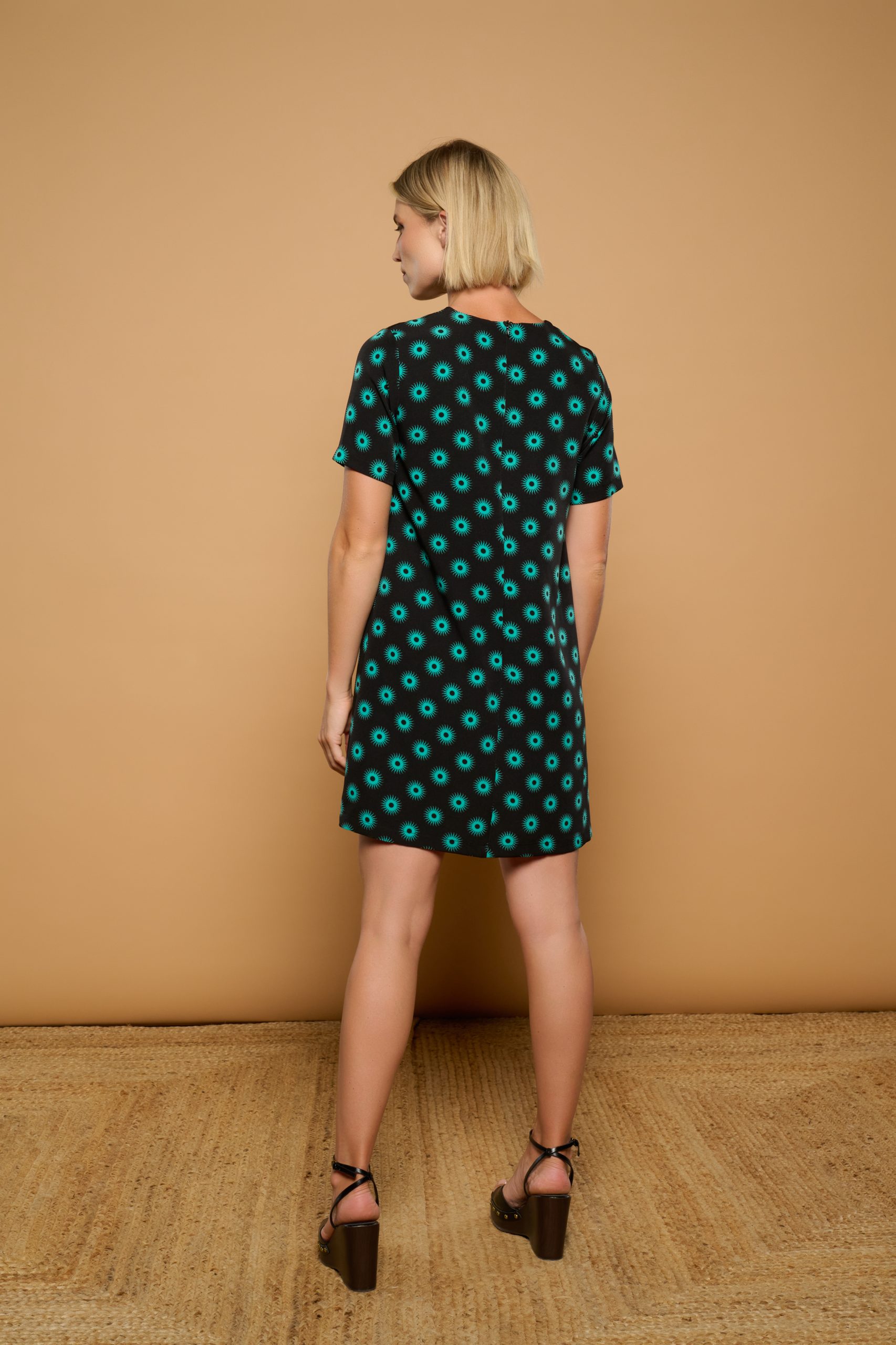 Φόρεμα με στρογγυλή λαιμόκοψη και κοντό μανίκι. Σχεδιασμός με χαλαρή εφαρμογή. Κλείσιμο με φερμουάρ πίσω. Ελαστικό ύφασμα Εσωτερική επένδυση.