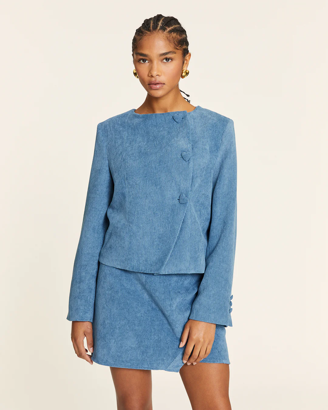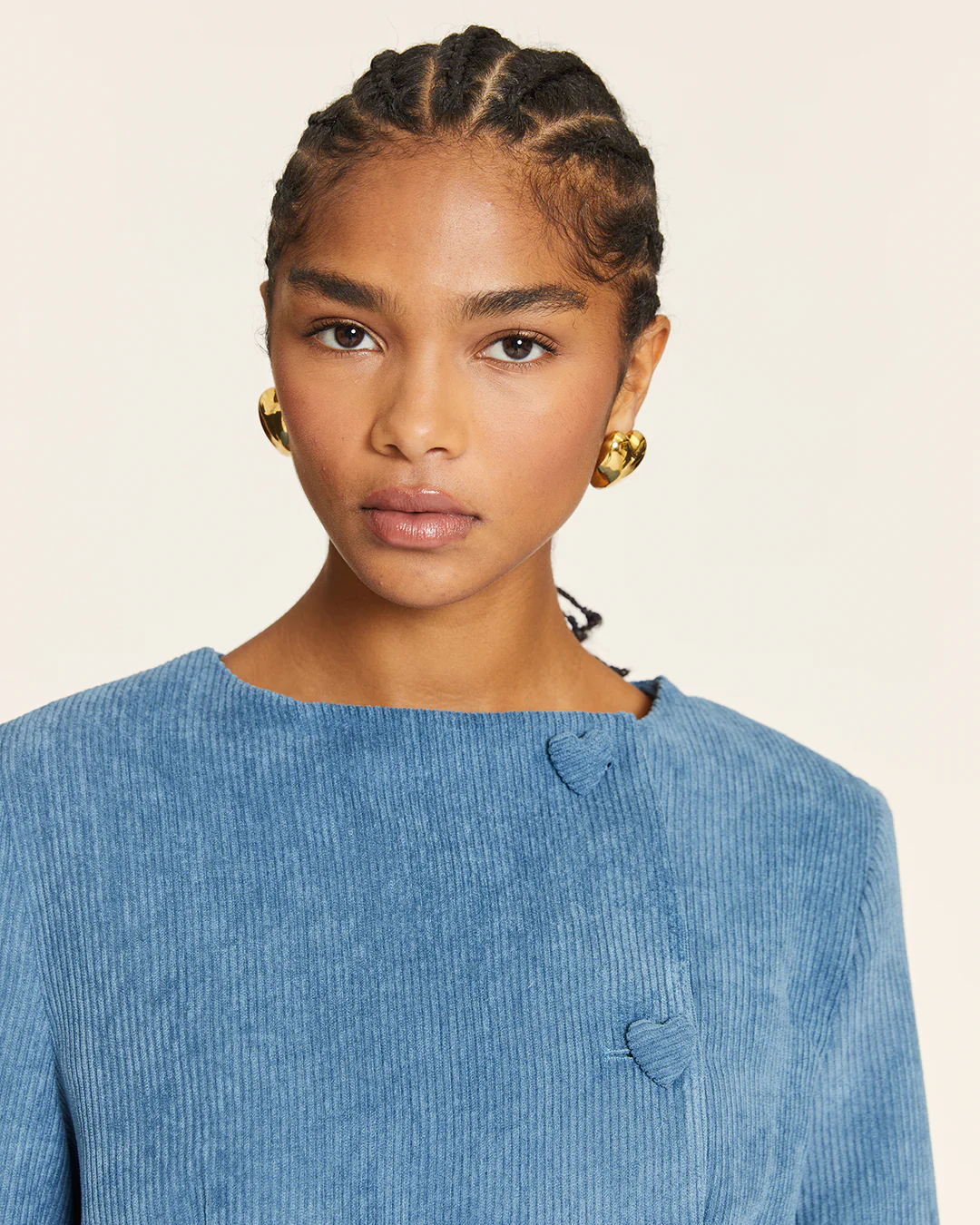 Short corduroy jacket with an asymmetrical cut, boat neck, and long straight sleeves. Heart-shaped button closure at the front.