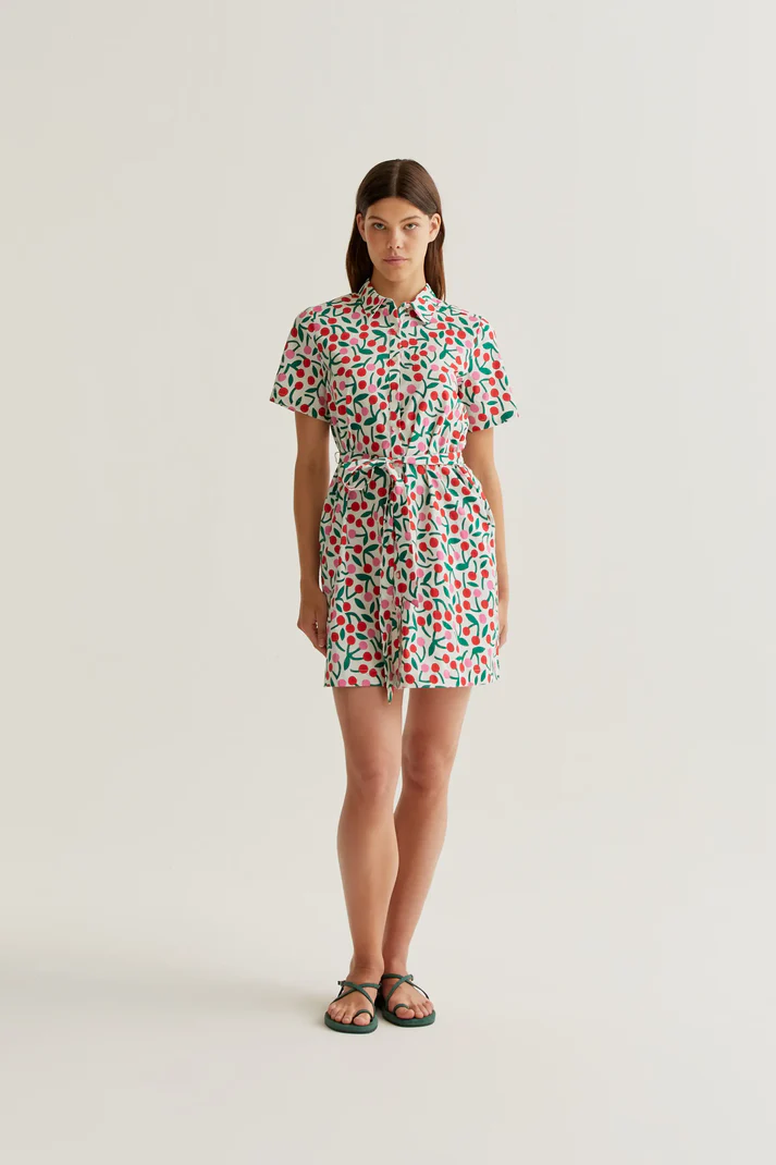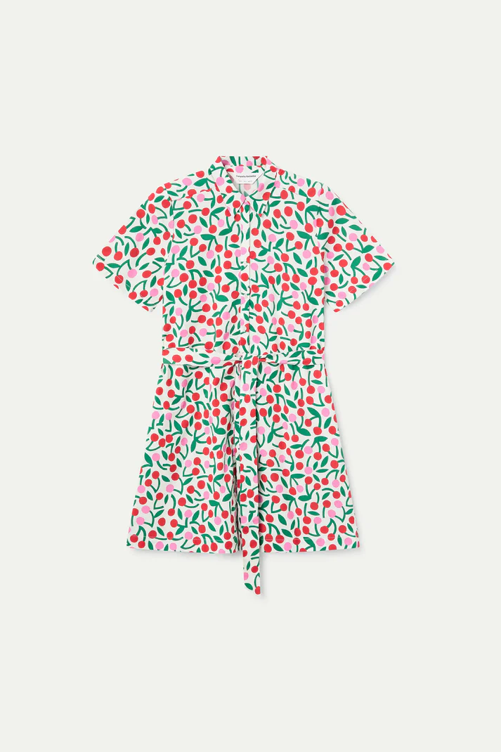 Short dress in 100% cotton with a burgundy print. Lapel collar and short sleeves. Front button closure with white buttons and tie waist.