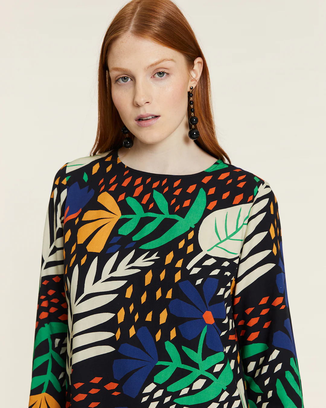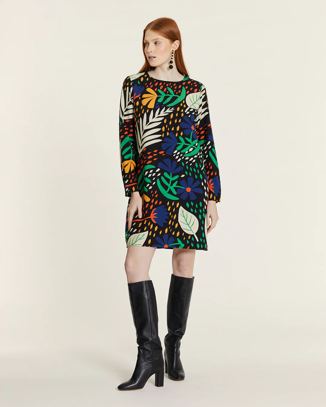 Short garden dress, above the knee, scoop neck, long straight sleeves and cuffs